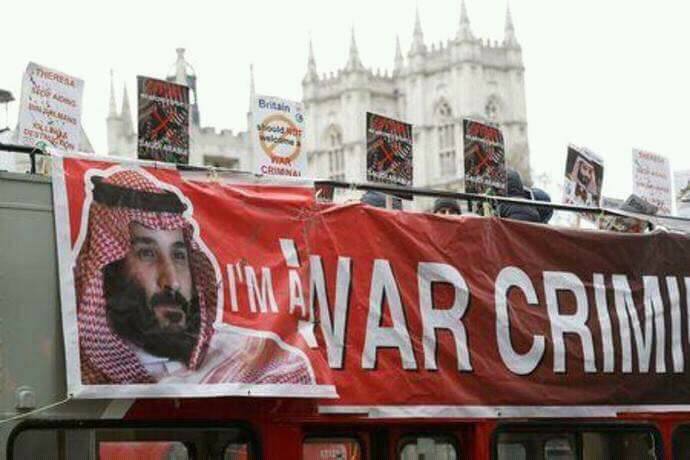 وتجمع المحتجون أمام مقر رئيسة الوزراء في 10 داوننغ ستريت في أثناء لقائها بولي العهد السعودي، ورفعوا لافتات تندد باستقبال "مجرم حرب"، وتطالب بإنهاء الحرب في اليمن.