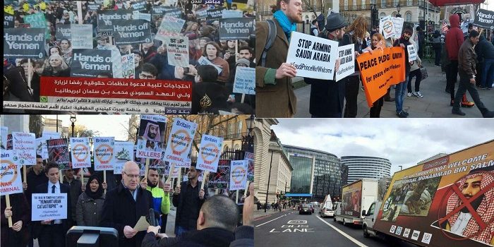 وتشهد شوارع وميادين لندن في هذه الاثناء مظاهرات ووقفات احتجاجية غير مسبوقة ، تعالت فيها الأصوات في شوارع بريطانيا وفي برلمانها للتنديد بزيارة ولي العهد السعودي محمد بن سلمان باعتباره "دكتاتورا" في بلاده ومسؤولا عن مآسي المدنيين في حرب اليمن.