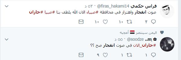 حيث قال فراس حكمي في تغريده على صفحته رصدها الرابط " صوت انفجار واهتزاز في محافظة #صبياء الان الله يلطف بنا #صبيا #جازان "
