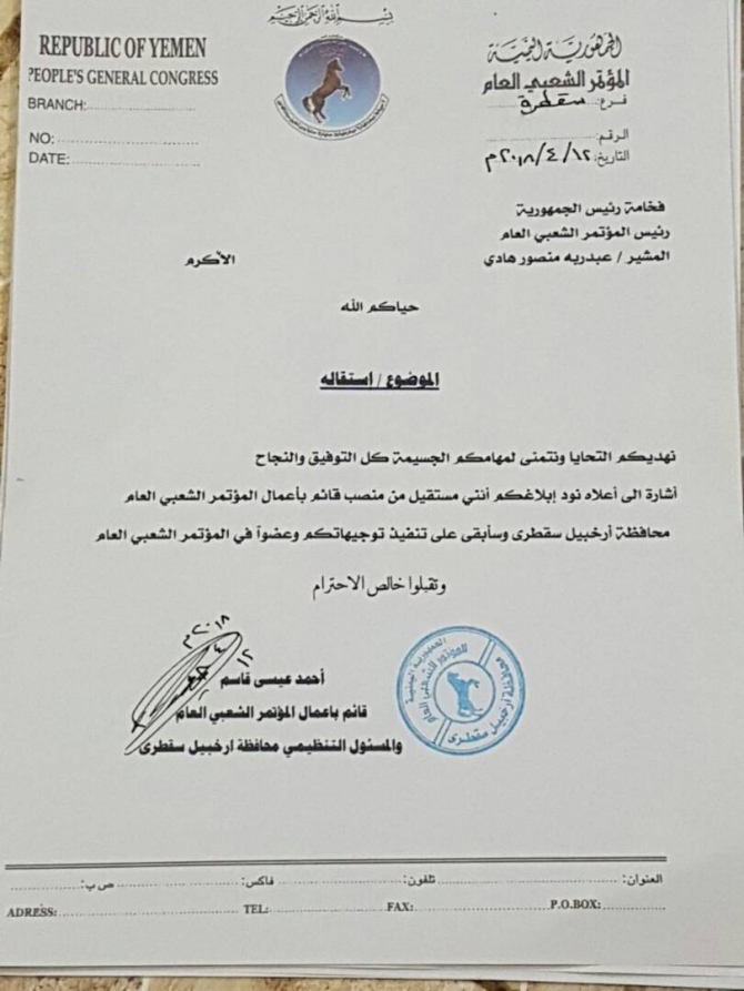 شهدت الساعات الماضية عاصفة استقالات لمسئولين كبار في حكومة هادي عقب تعيين هادي لمحافظ جديد لجزيرة سقطرى ومدير أمن .