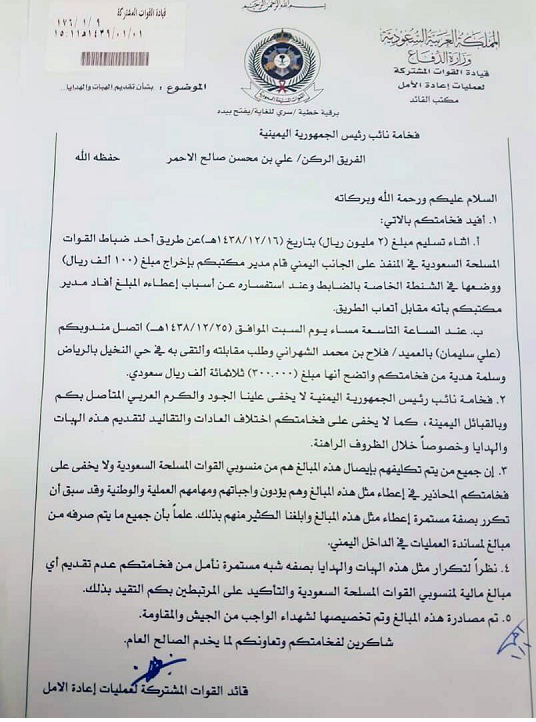 البرقية المرسلة من وزارة الدفاع السعودية التي يتولاها ولي العهد محمد بن سلمان، إلى نائب الرئيس اليمني المستقيل عبد ربه منصور هادي، الجنرال علي محسن الأحمر، تتضمّن توبيخاً للأخير على خلفية اتهامات بتقديمه أموالاً لضباط سعوديين. تتهم البرقية، الممهورة بعبارة «سري للغاية»، والمرسلة باسم قائد العمليات المشتركة في الحرب على اليمن، بتاريخ 23 سبتمبر/ أيلول الماضي، الجنرالَ اليمني المخضرم وصاحب النفوذ الكبير في اليمن بتقديمه أموالاً للضباط السعوديين المتعاونين مع قواته، سواء على الحدود، أو في العاصمة السعودية الرياض.