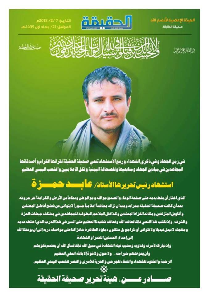 في زمن الجهاد وفي ذكرى الشهداء وربيع الاستشهاد تنعي صحيفة الحقيقة لقرائها الكرام وأصدقائها المجاهدين في ميادين الجهاد ومتابعيها وللصحافة اليمنية ولكل الإعلاميين والشعب اليمني العظيم استشهاد رئيس تحريرها الأستاذ عابد حمزة الذي اختار أن يخط بدمه على صفحة الوفاء والصدق مع الله ومع الوطن ودفاعاً عن الأرض والكرامة آخر حروفه بعد أن كانت صحيفة الحقيقة محرابه وميدان نزاله مجاهداً إعلامياً جسوراً لا يتوانى عن فضح أباطيل المضلين وأقاويل المتزلفين ومكائد الغزاة المعتدين، وإذ نكتب هذا النعي فإننا نعاهد الله ونعاهد شهيدنا العظيم على السير في هذا الدرب الذي اختطه بدمه ومهجته لا نبدل تبديلا ولا نتوانى أو نتراجع بل ستكون دماؤه الطاهرة حافزاً لنا على مواصلة دربه إلى أن يوفقنا الله إلى أحد الحسنين النصر أو الشهادة.