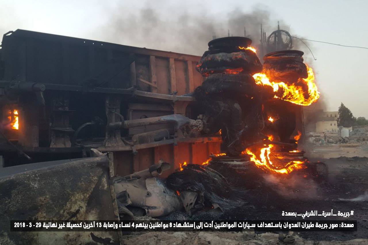 وأفادت مصادر محلية استشهاد 8 مواطنين بينهم 4 نساء واصابة 13 آخرين جراء غارة استهدفتهم أثناء تواجدهم في سيارة داخل مدينة صعدة مؤكدة أن الحصيلة أولية .