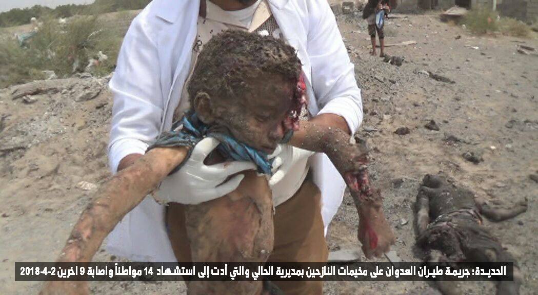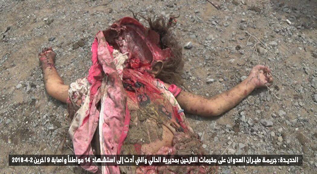 وذكرت مصادر محلية أن الغارتين لطيران العدوان استهدفتا مخيمات النازحين بمديرية الحالي بمحافظة الحديدة، وأن النازحين المستهدفين فيها من مدينة حيس، ومن بين الشهداء 7 أطفال بالإضافة إلى عدد من النساء ، مشيرة إلى أنها حصيلة أولية .