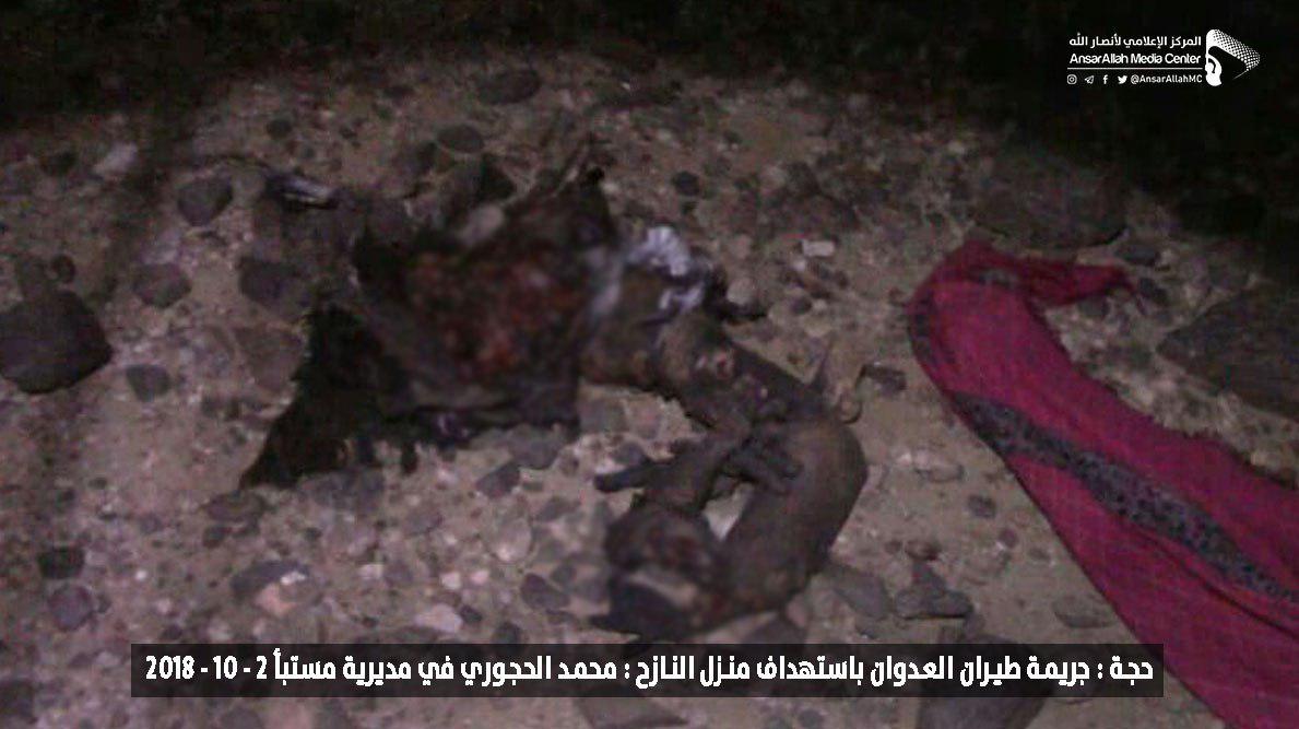 استهدف طيران تحالف حرب العدوان فجر يومنا هذا الثلاثاء منزل المواطن محمد علي حسن حجوري نازح من مديرية حيران إلى مديرية مستباء والذي استهدفه الطيران بغاره جويه اودت بأسرته كامله حيث استشهد النازح محمد علي حجوري مع زوجته وابنته البالغة من العمر تسع سنوات .